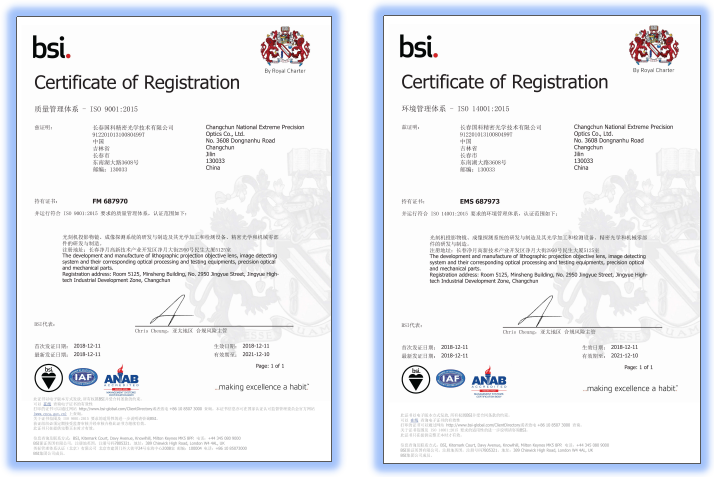 2018年12月11日,长春国科精密光学技术有限公司通过英国标准协会(BSI)权威认证,获颁ISO 9001:2015质量管理体系和ISO 14001:2015环境管理体系认证证书。